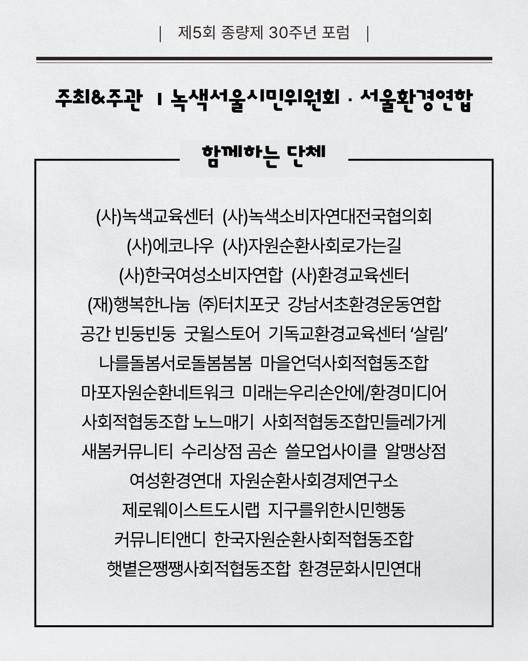 종량제 봉투 시행 30주년을 맞아, 서울시 자원순환 관리 시스템을 돌아보고 과제와 대안을 도출하는 [종량제 30주년 포럼]을 5회에 걸쳐 진행하고 있습니다. 그 마지막 포럼 <서울의 음식물 쓰레기, 이대로 괜찮은가> 에 대해 안내드립니다.