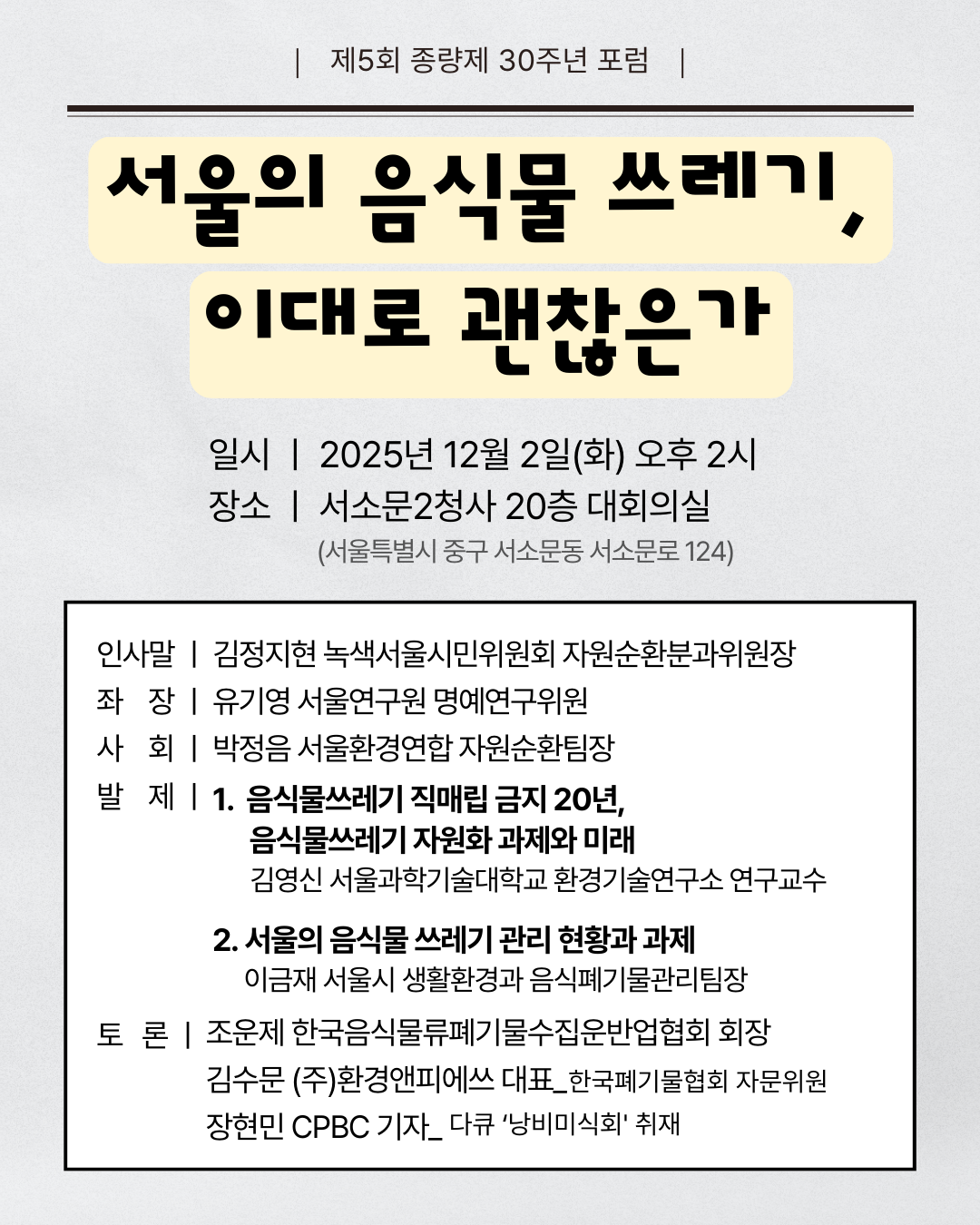 종량제 봉투 시행 30주년을 맞아, 서울시 자원순환 관리 시스템을 돌아보고 과제와 대안을 도출하는 [종량제 30주년 포럼]을 5회에 걸쳐 진행하고 있습니다. 그 마지막 포럼 <서울의 음식물 쓰레기, 이대로 괜찮은가> 에 대해 안내드립니다.<서울의 음식물 쓰레기, 이대로 괜찮은가>📅 2025년 12월 2일(화) 14:00 - 16:00📍 서소문2청사 20층 대회의실(서울특별시 중구 서소문동 서소문로 124)✅주최,주관 : 녹색서울시민위원회, 서울환경연합👇👇신청하기👇👇https://go.seoulkfem.or.kr/85rms0🗣인사말 ㅣ 김정지현 녹색서울시민위원회 자원순환분과위원장🗣좌 장 ㅣ 유기영 서울연구원 명예연구위원🗣사 회 ㅣ 박정음 서울환경연합 자원순환팀장